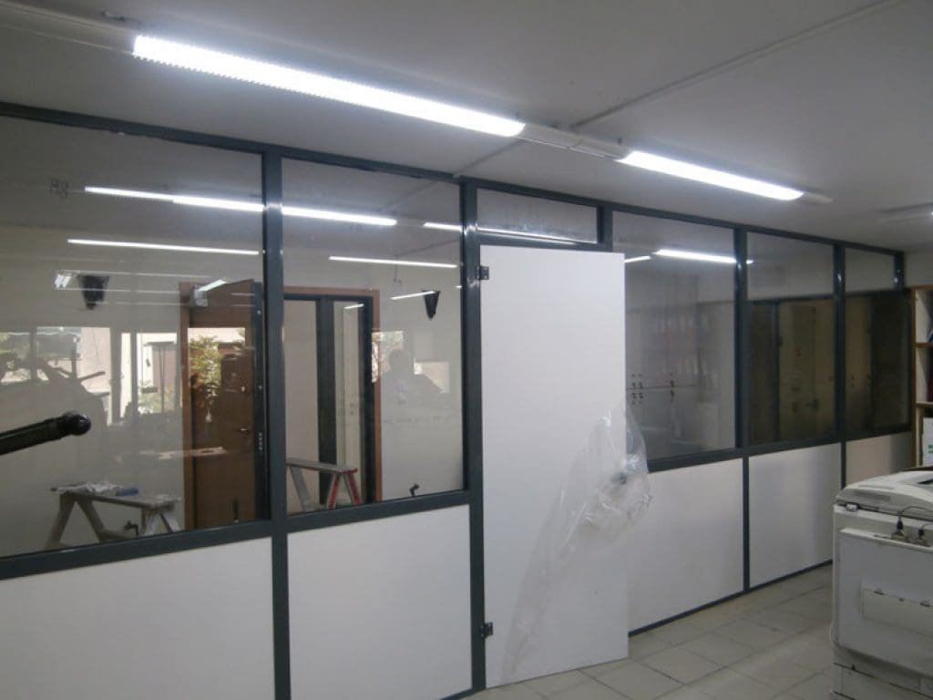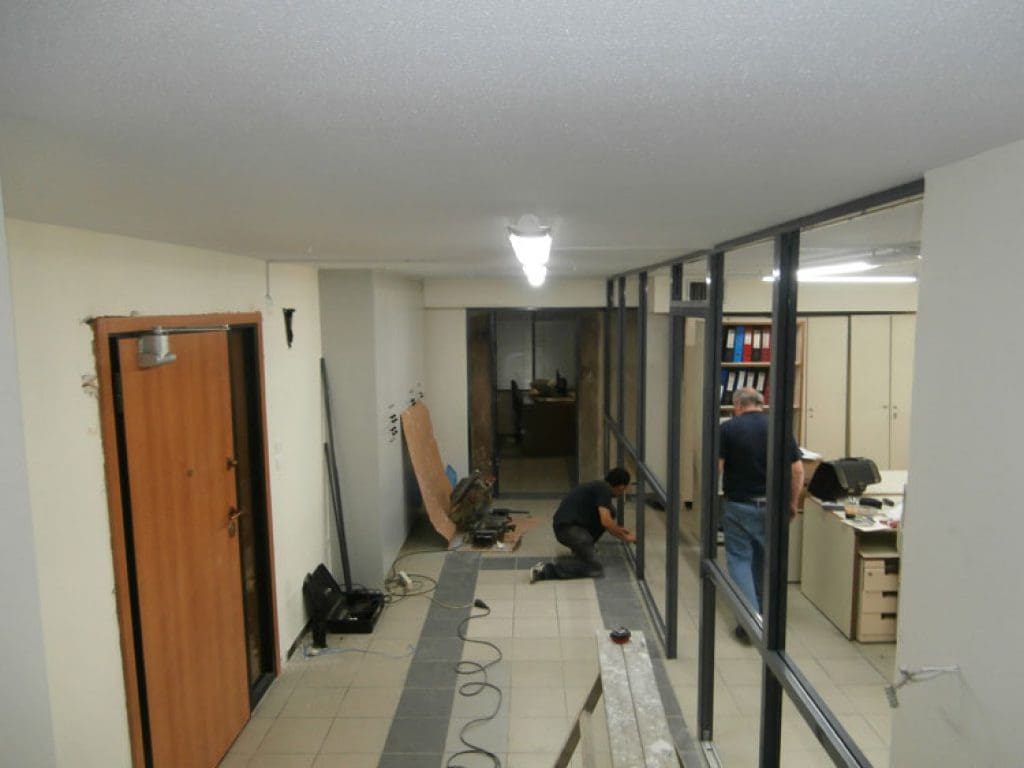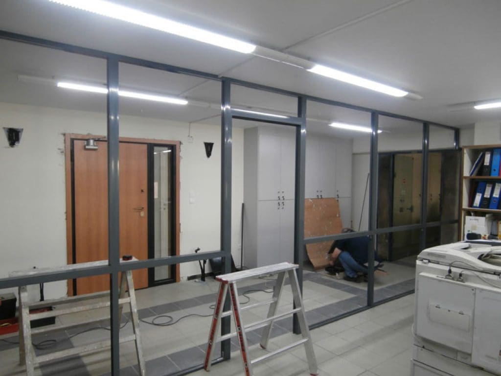Έγινε κατασκευή εσωτερικού διαχωριστικού γραφείων αποτελούμενο από προφίλ αλουμινίου, πάνελ πρεσσαριστό με υαλοπίνακες, και θωρακισμένης πόρτας ασφαλείας.