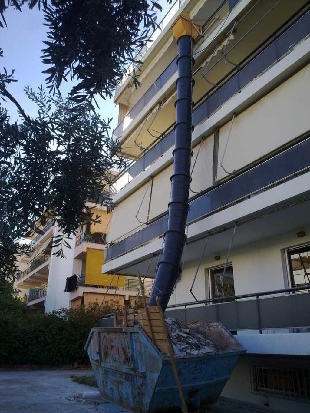 Εξωτερικά συνεχίσαμε με την αποξήλωση των καγκέλων των μπαλκονιών, το τρίψιμο-γυάλισμα των μαρμάρων, την μόνωση της ταράτσας.