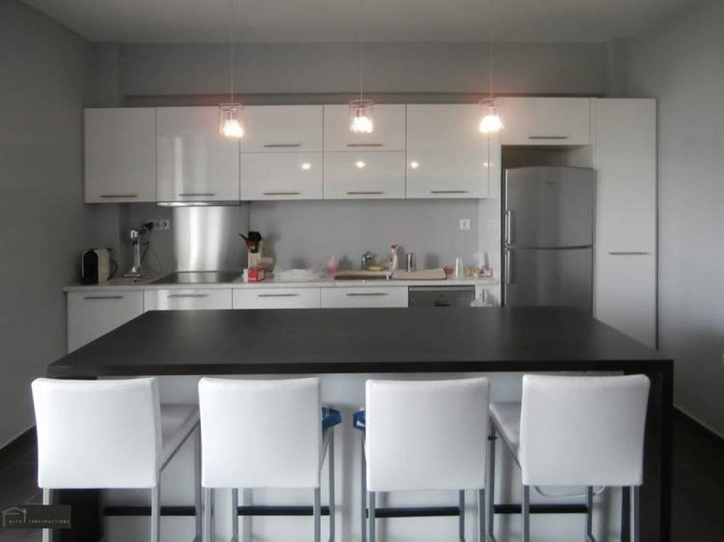 Κατασκευάστηκαν νέα έπιπλα κουζίνας με γυαλιστερά πορτάκια βακελίτη και μασίφ πάγκο κουζίνας.