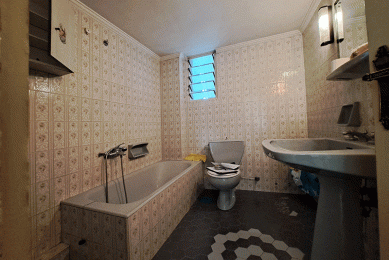 Στο λουτρό τοποθετήθηκε έπιπλο σε μοντέρνο σχέδιο με ξύλινες επιφάνειες και καθρέπτη με φωτισμό επί τοίχου, τα οποία και συνδυάστηκαν με γρανιτοπλακίδια τύπου τσιμεντοκονίας 60Χ 60. Ο χώρος ολοκληρώθηκε με την τοποθέτηση της κρεμαστής λεκάνης με εντοιχισμένο καζανάκι, των μπαταριών και της καμπίνας.