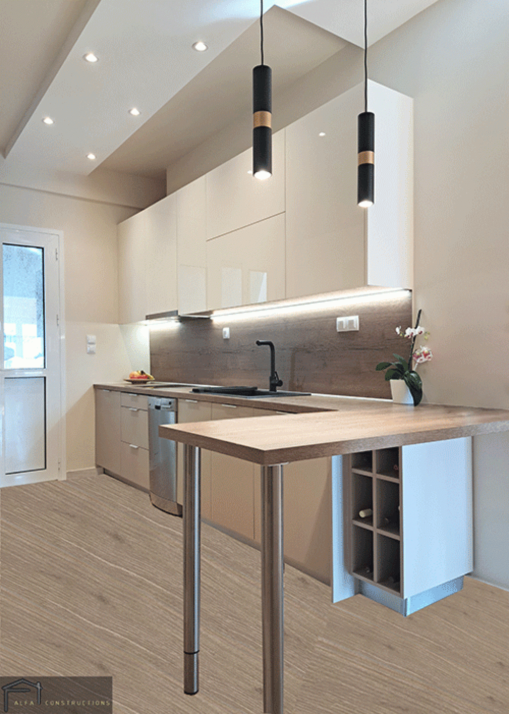 Τα έπιπλα κουζίνας συνδυάζουν την λευκή διαχρονική αισθητική με το φυσικό ξύλο πάγκου – πλάτης και το μοντέρνο στοιχείο του μαύρου χρώματος νεροχύτη και μπαταρίας.