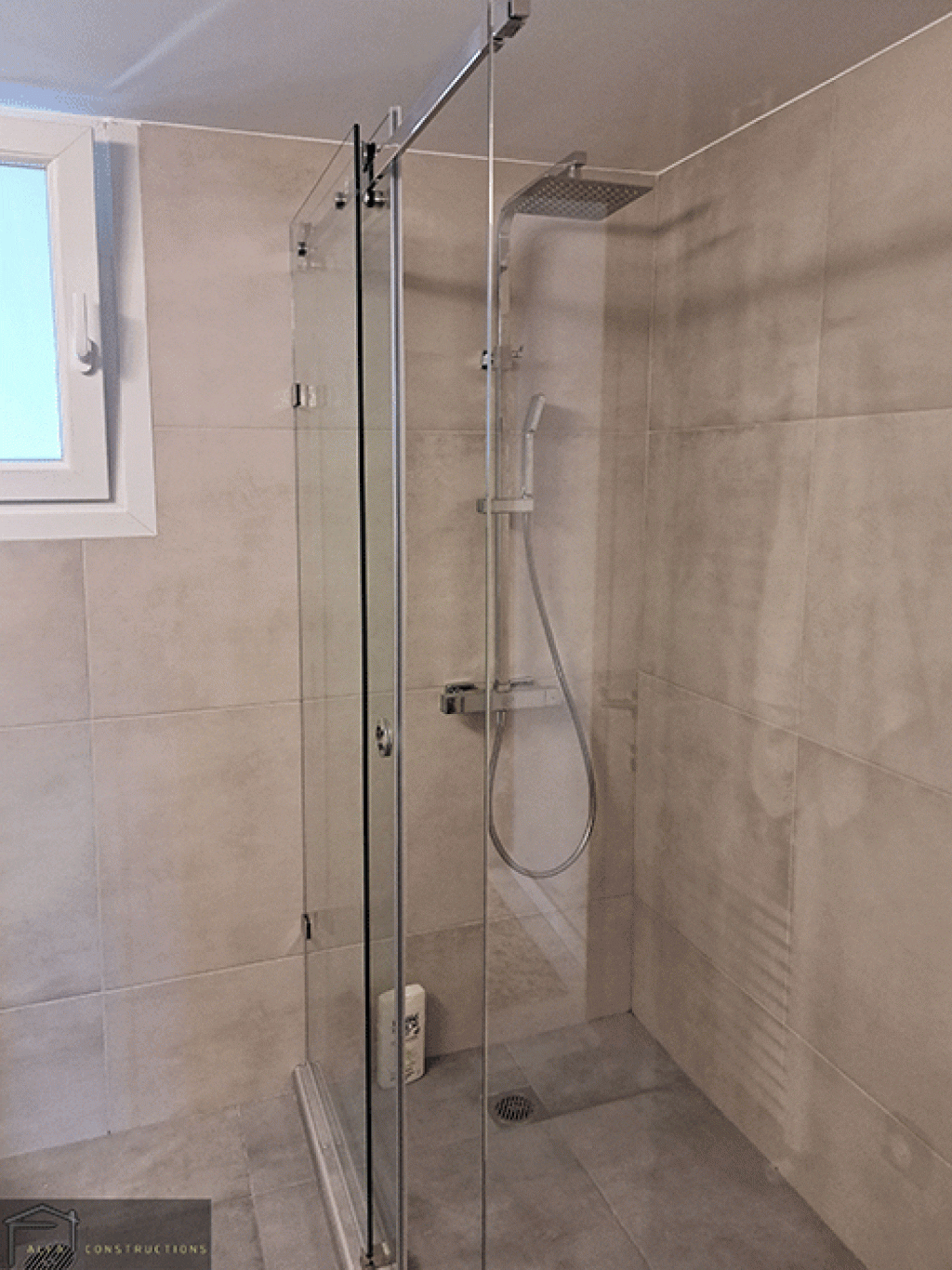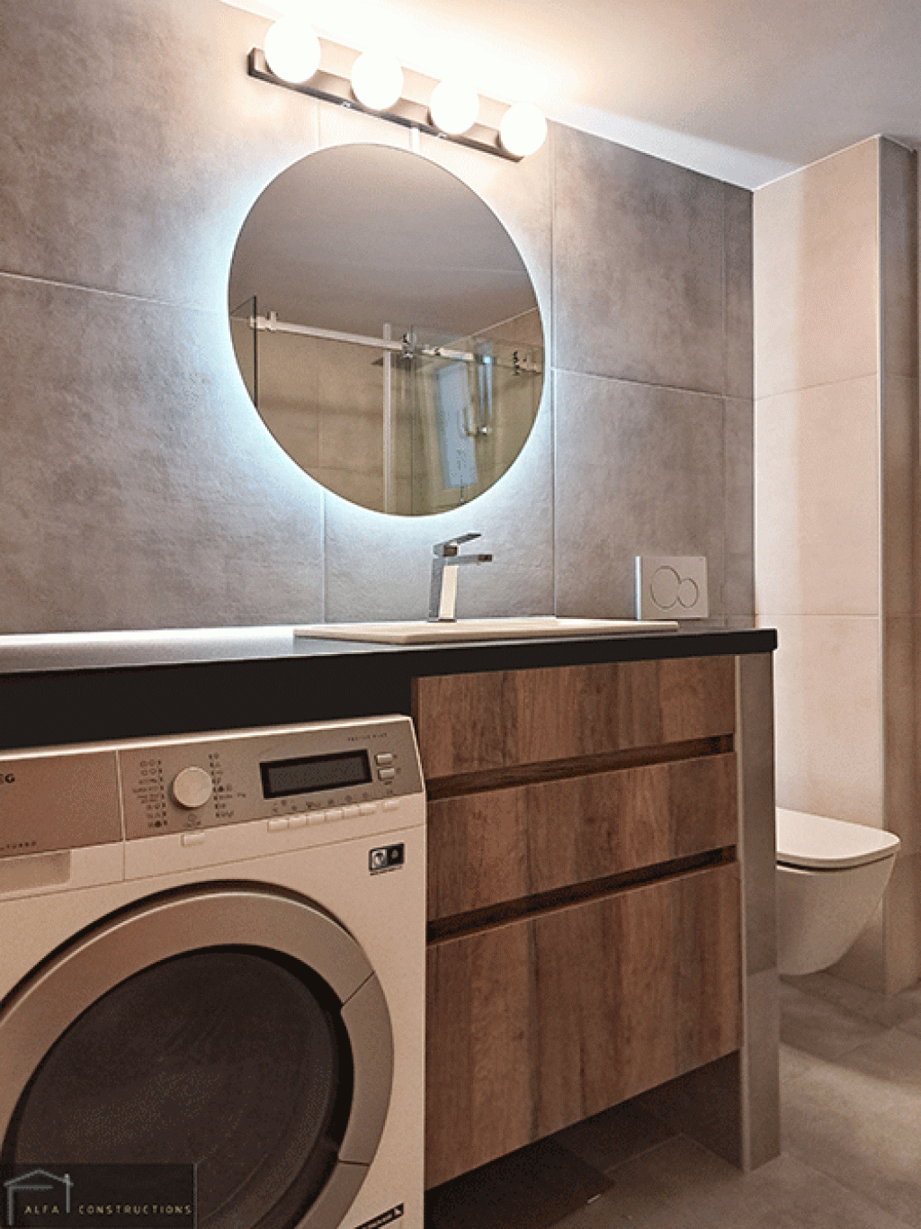 Στο λουτρό τοποθετήθηκε έπιπλο σε μοντέρνο σχέδιο με ξύλινες επιφάνειες και καθρέπτη με φωτισμό επί τοίχου, τα οποία και συνδυάστηκαν με γρανιτοπλακίδια τύπου τσιμεντοκονίας 60Χ 60. Ο χώρος ολοκληρώθηκε με την τοποθέτηση της κρεμαστής λεκάνης με εντοιχισμένο καζανάκι, των μπαταριών και της καμπίνας.