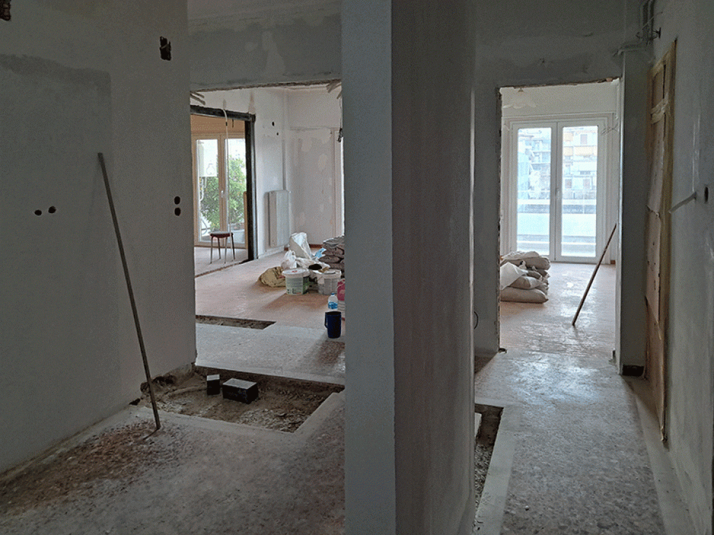 Η διαδικασία των εργασιών τέθηκε σε εφαρμογή με τις γενικές αποξηλώσεις, τις καθαιρέσεις των τοίχων, την ηλεκτρολογική και την υδραυλική εγκατάσταση.