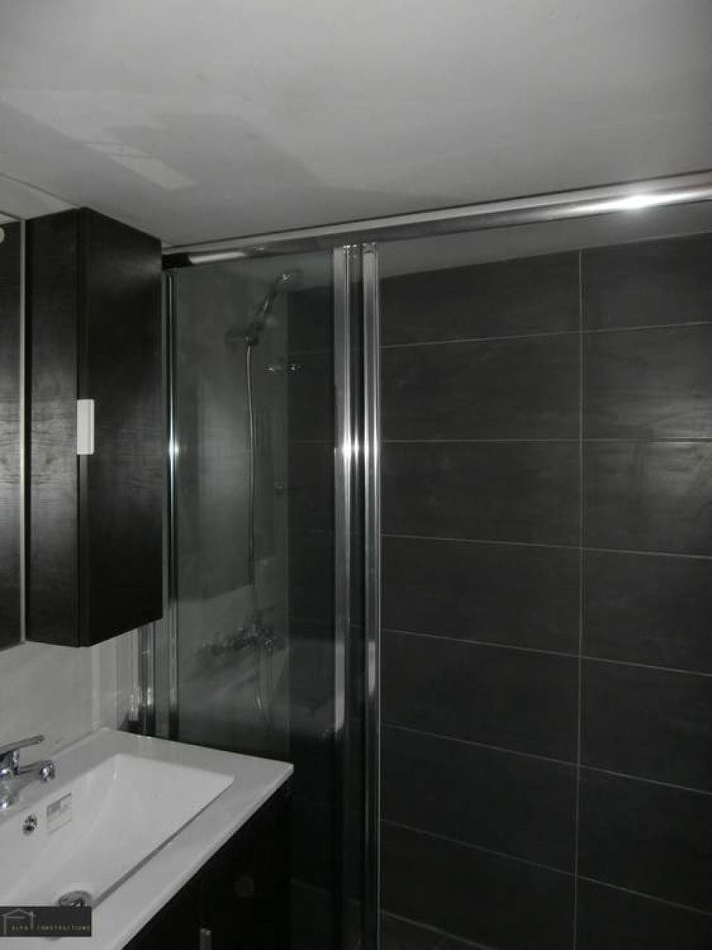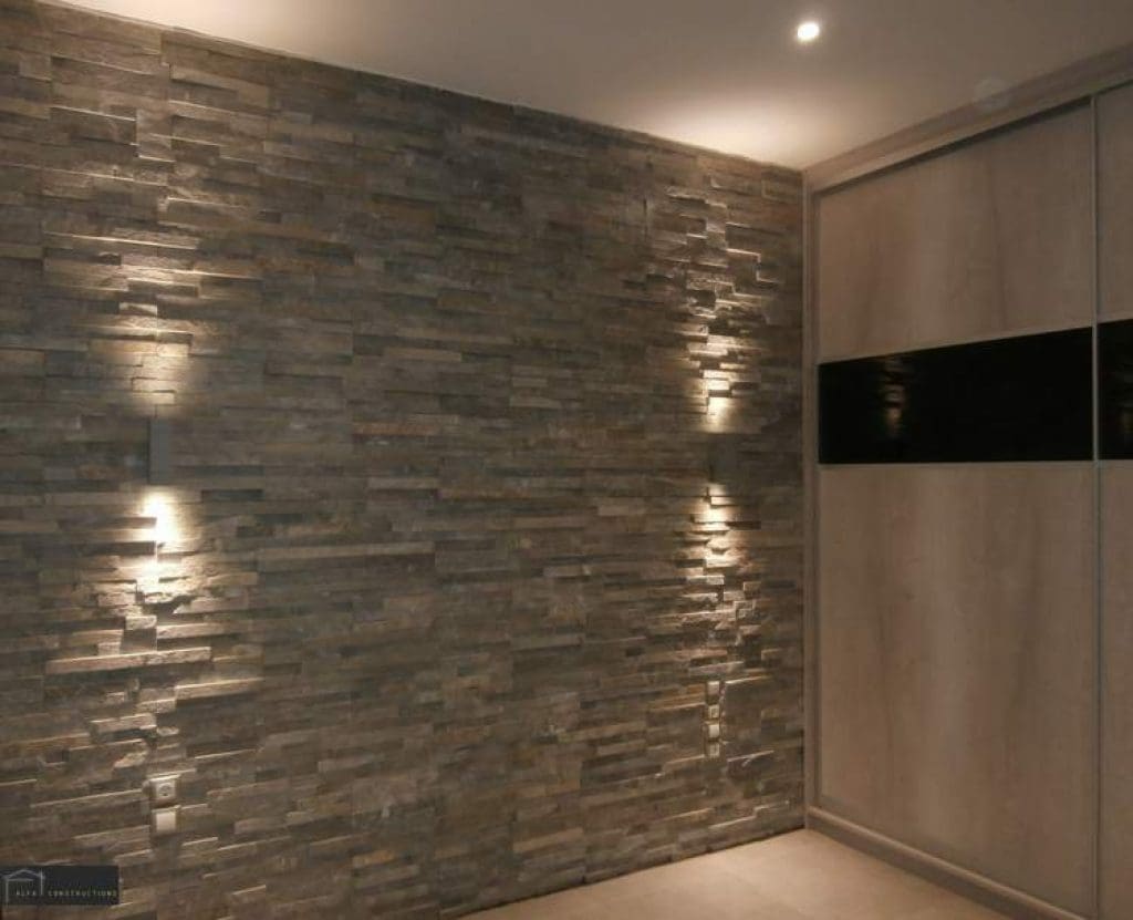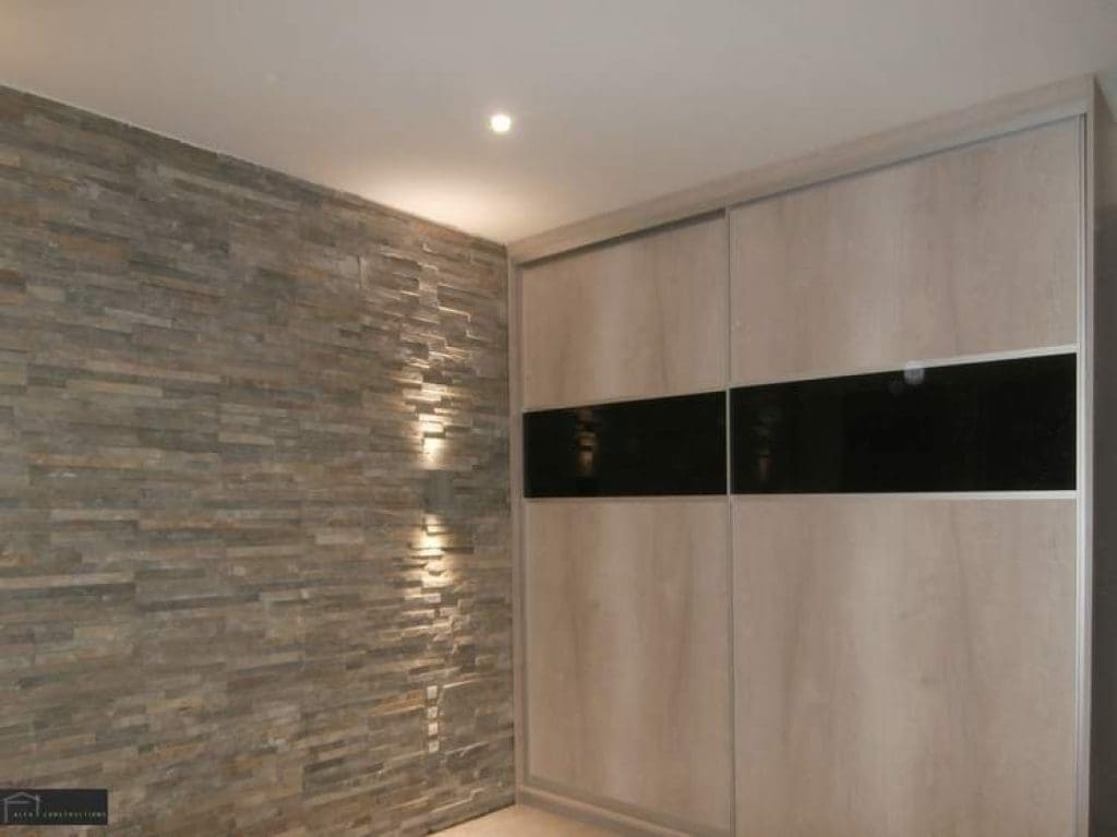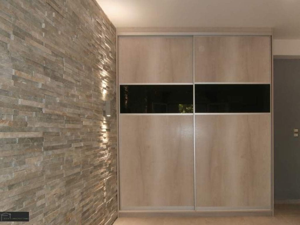 Ο τοίχος δίπλα από την συρόμενη ντουλάπα επενδύθηκε με πάνελ φυσικής πέτρας χρώματος γκρι αφού προηγήθηκε η μόνωσή του.
