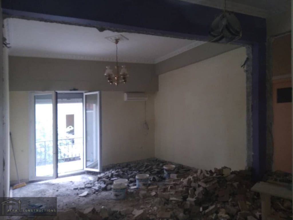 Εφόσον καθαιρέθηκαν οι τοίχοι που ήταν απαιτητό για την νέα διαρρύθμιση, αποξηλώθηκαν όλα τα παλαιά μωσαϊκά του σπιτιού, και όλες οι παλαιές υδραυλικές και ηλεκτρολογικές εγκαταστάσεις.