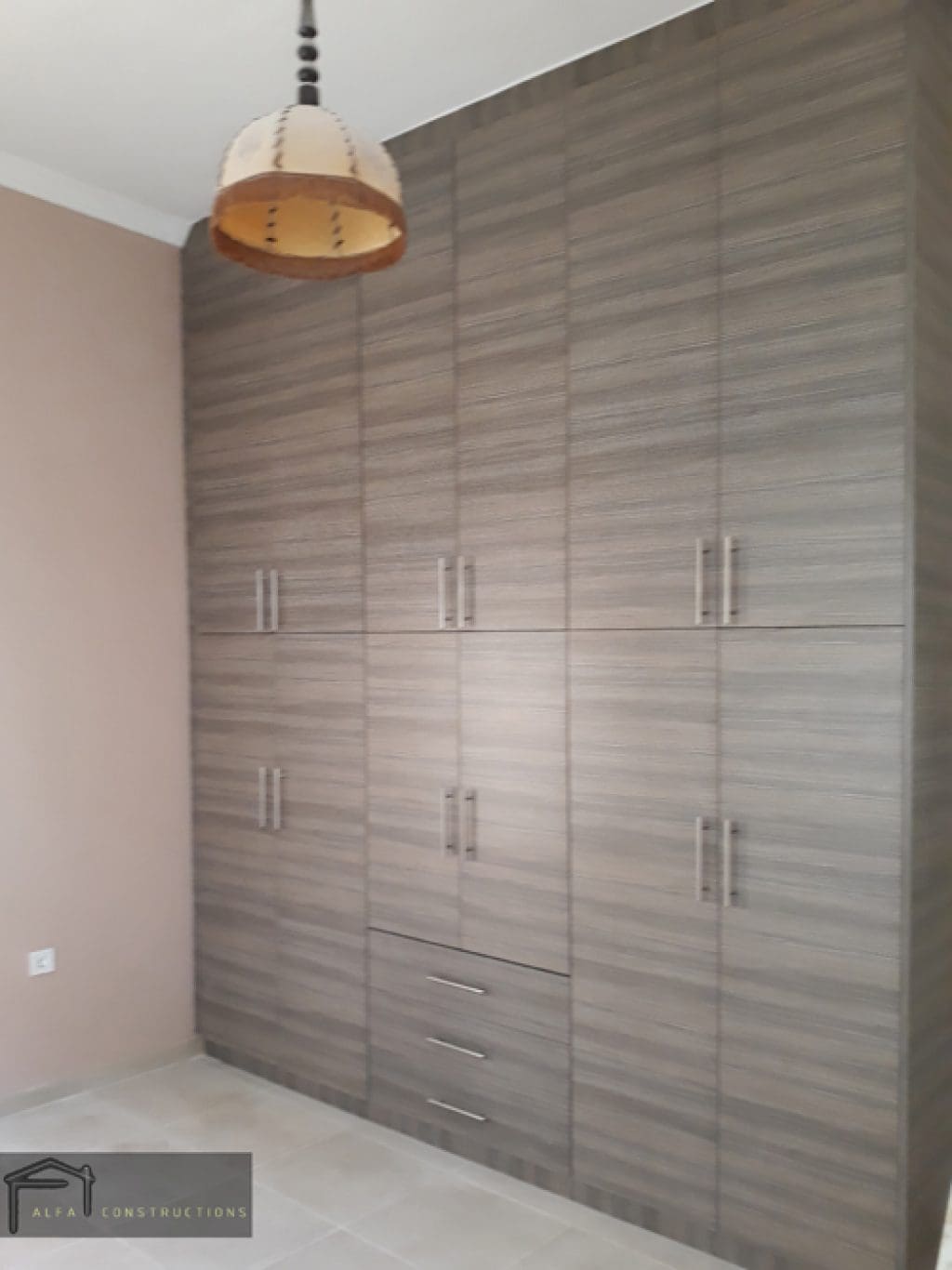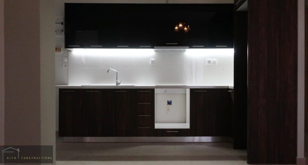 Τοποθετήθηκαν βεκελιτικές ντουλάπες με πόμολα αλουμινίου και λευκές εσωτερικές πόρτες c.p.l. και ενεργειακά κουφώματα αλουμινίου.