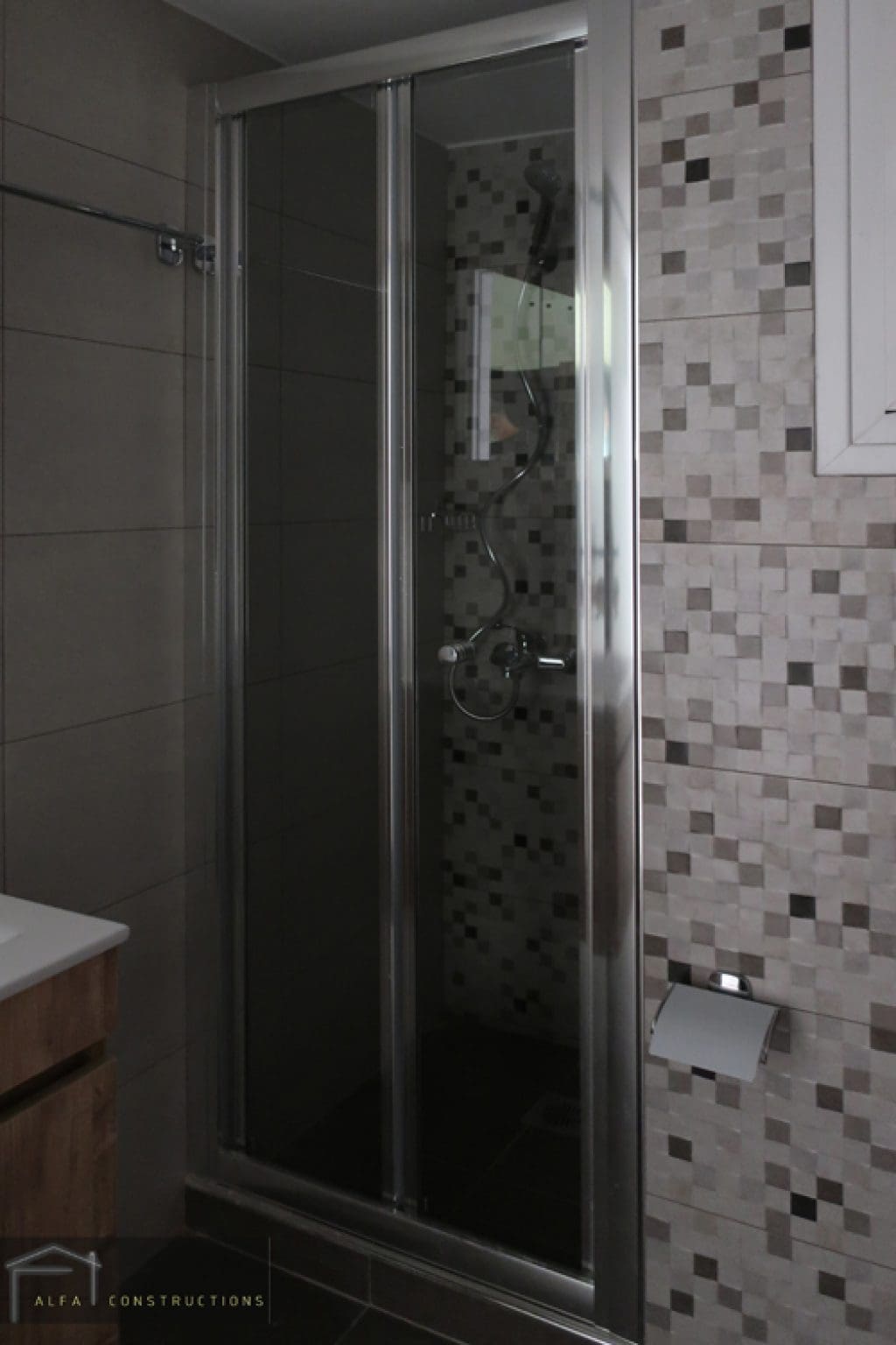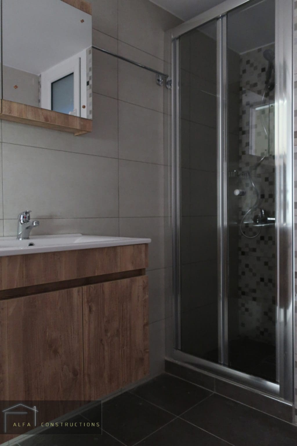 Η ανακαίνιση μπάνιου ολοκληρώθηκε με την τοποθέτηση των ειδών υγιεινής, της καμπίνας, του επίπλου και των μπαταριών.
