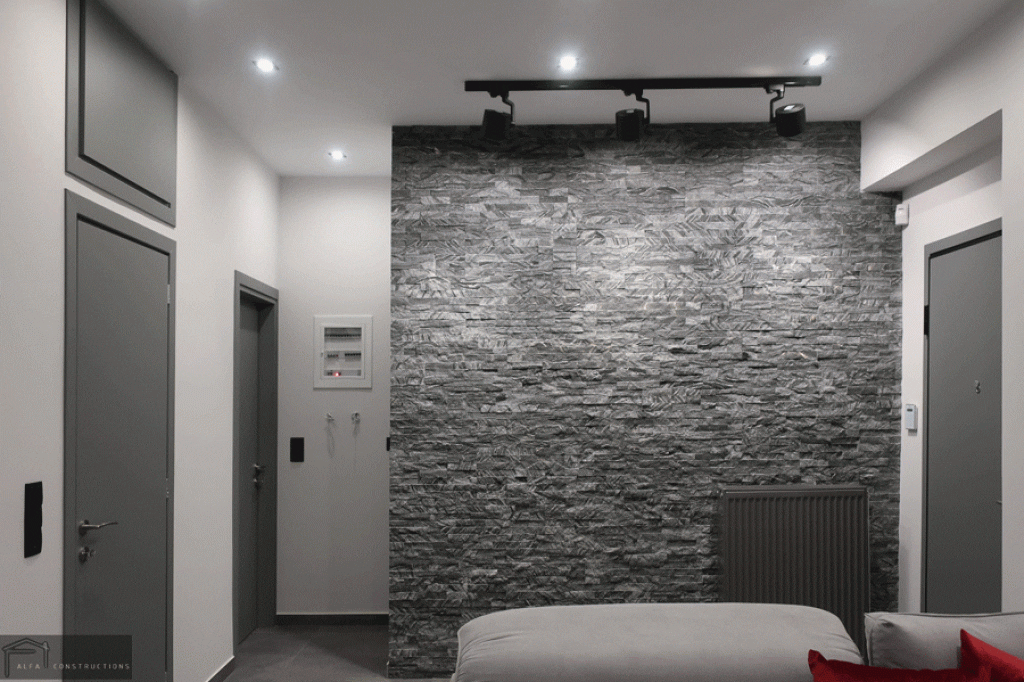 Ο τοίχος της εισόδου που αποτελεί μέρος του καθιστικού, επενδύθηκε με φυσική πέτρα που αποτελείται από συνδυασμό ψυχρών χρωμάτων γκρι – λευκού – μαύρου.