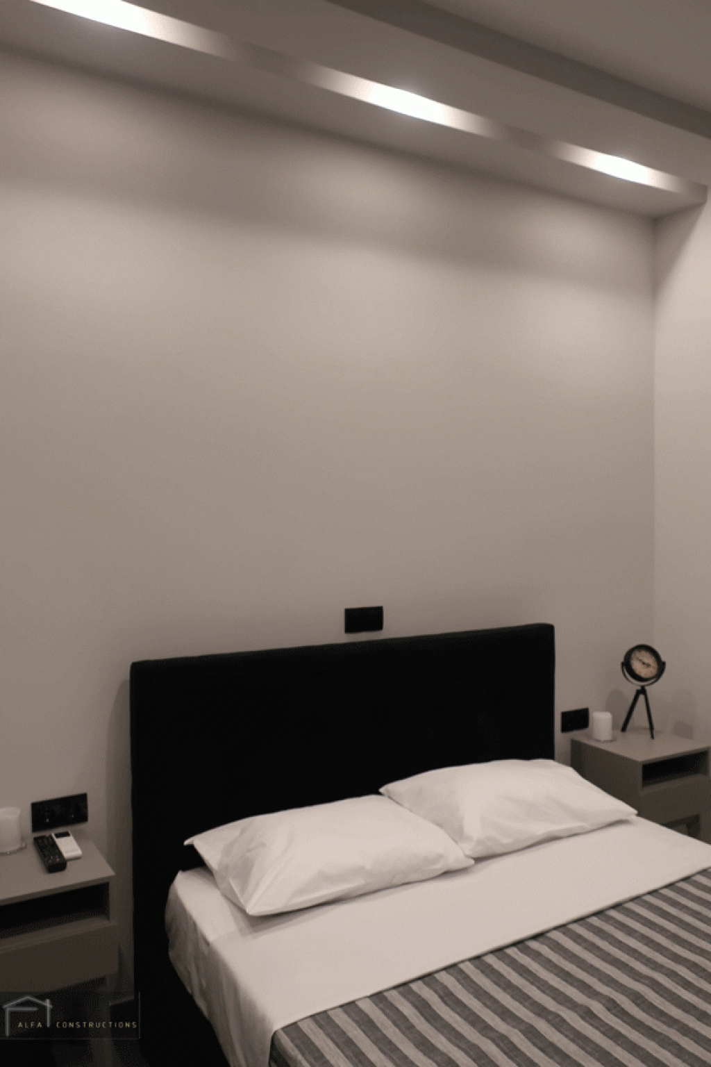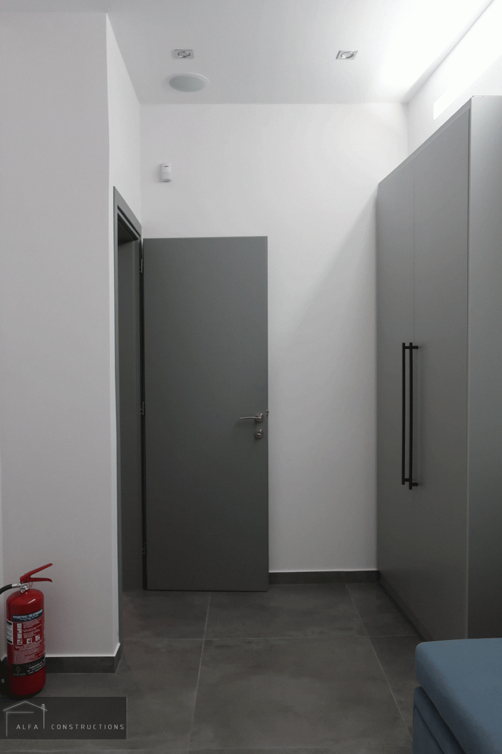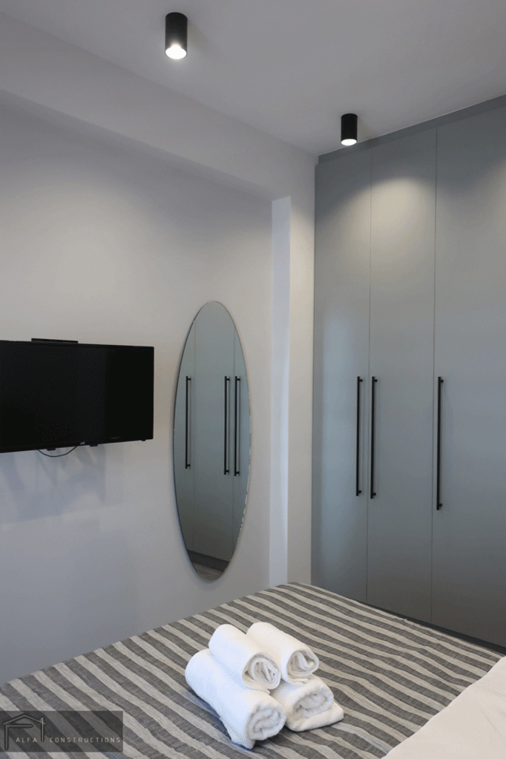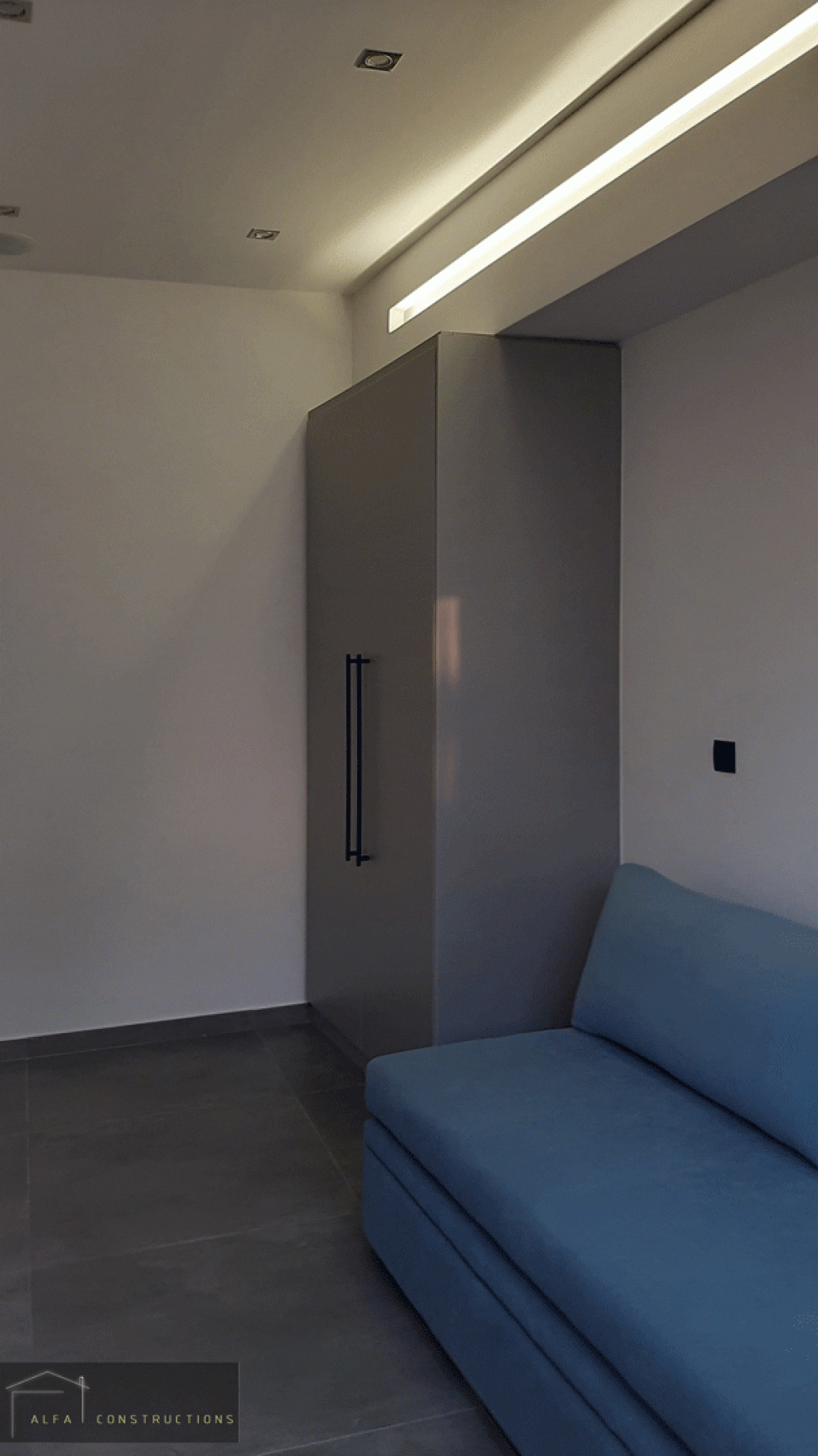Στα υπνοδωμάτια τοποθετήθηκαν ανοιγόμενες ντουλάπες γκρι χρώματος, με μαύρες μπάρες και led φωτισμό εσωτερικά.
