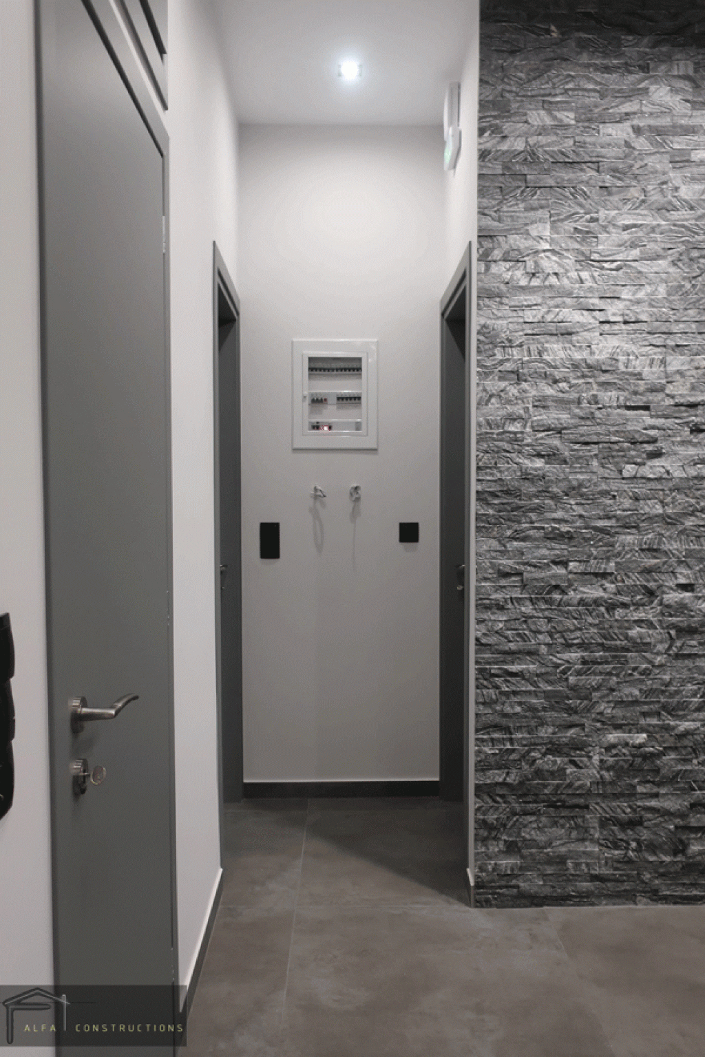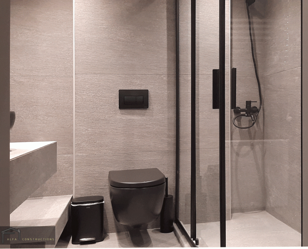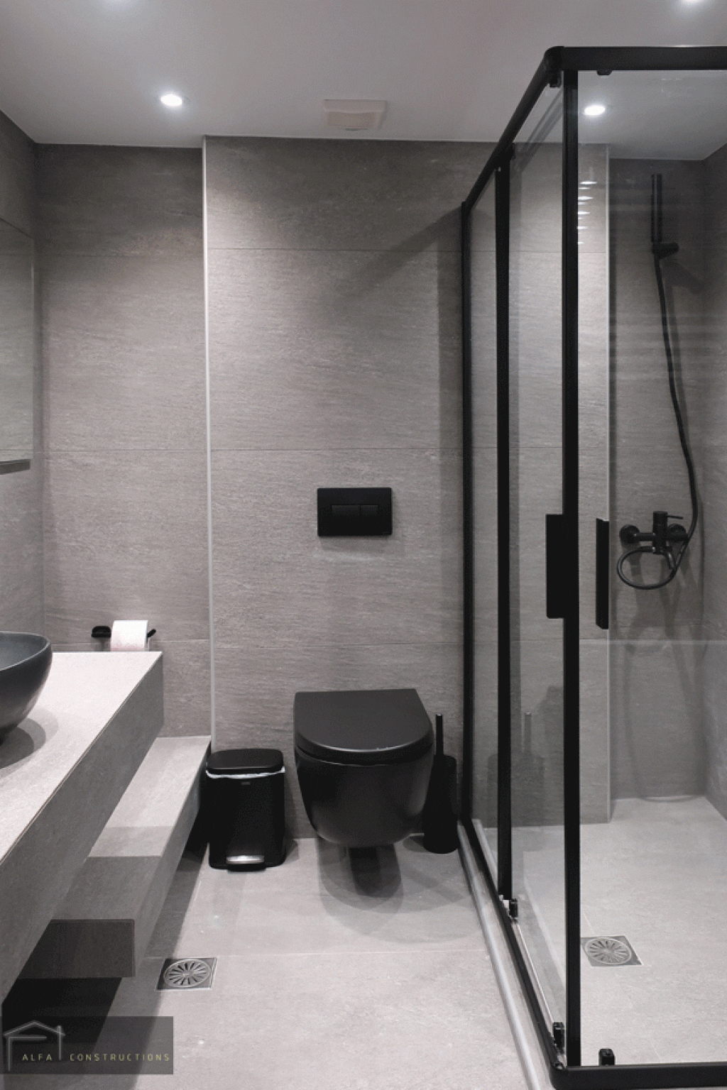 Στα δάπεδα του διαμερίσματος τοποθετήθηκαν γρανιτοπλακίδια 81 Χ 81 γκρι χρώματος που παραπέμπουν σε πατητή τσιμεντοκονία. Στο χώρο του λουτρού, κατασκευάσθηκαν δύο παράλληλοι κτιστοί πάγκοι. Ακολουθώντας τους ίδιους χρωματισμούς, το μπάνιου επενδύθηκε με γρανιτοπλακίδια antislip με διάσταση 60 Χ 120 και για τα υπόλοιπα στοιχεία επιλέχθηκε το μαύρο χρώμα.