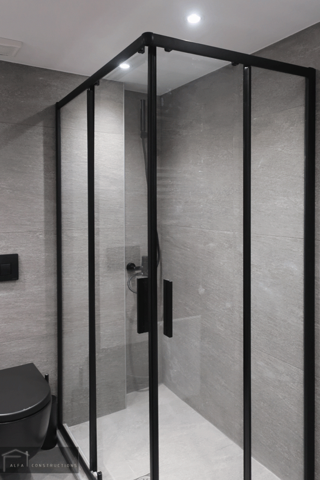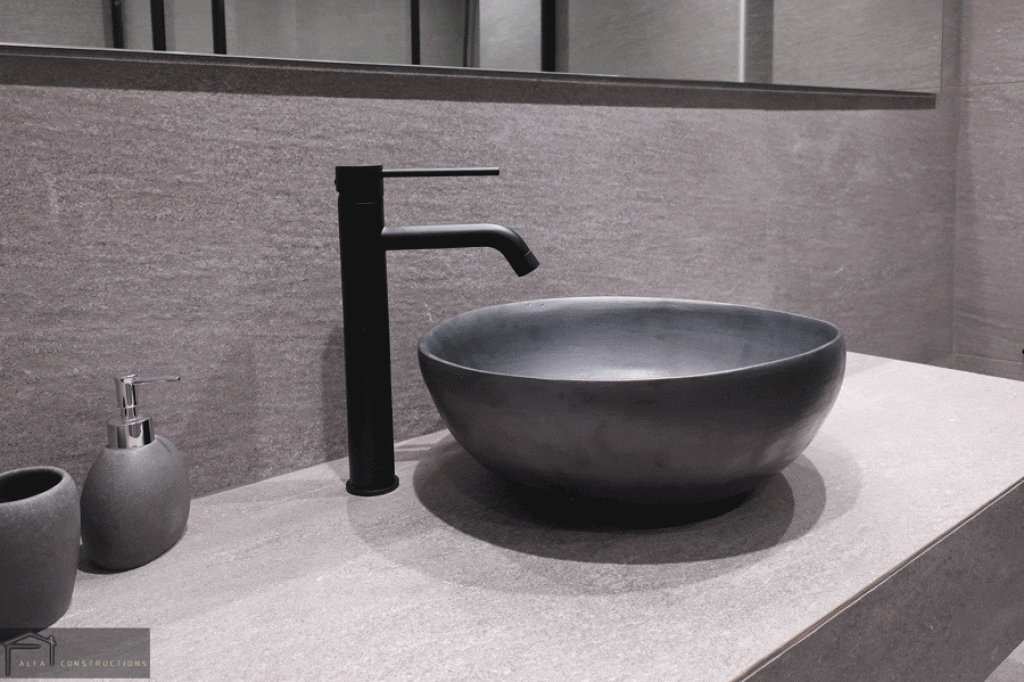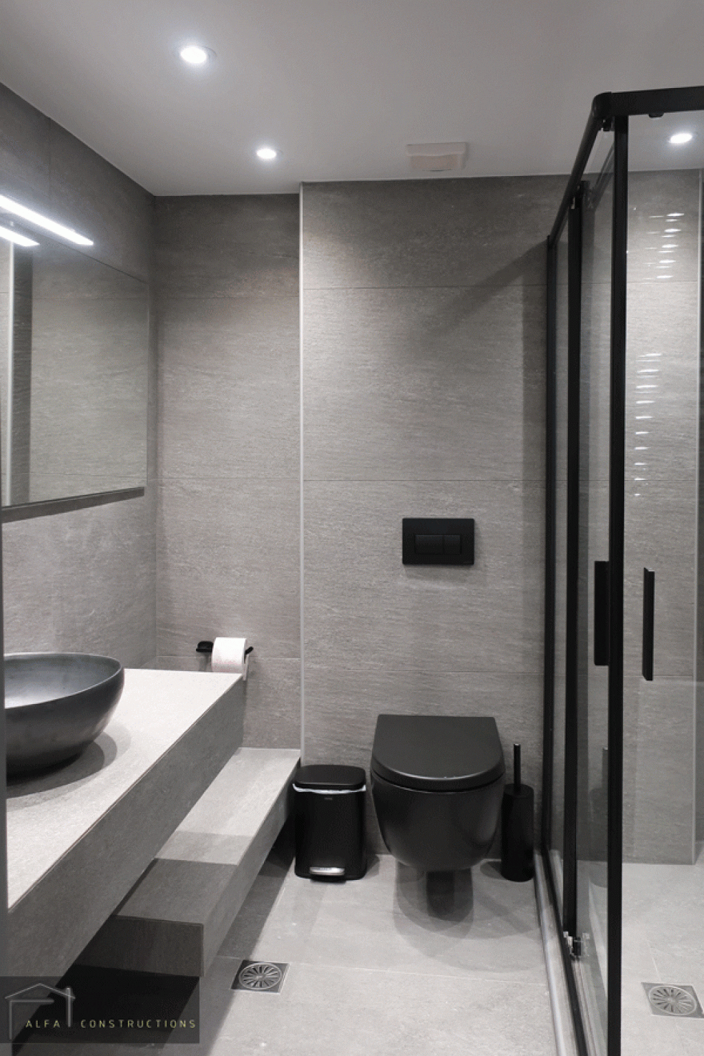 Στα δάπεδα του διαμερίσματος τοποθετήθηκαν γρανιτοπλακίδια 81 Χ 81 γκρι χρώματος που παραπέμπουν σε πατητή τσιμεντοκονία. Στο χώρο του λουτρού, κατασκευάσθηκαν δύο παράλληλοι κτιστοί πάγκοι. Ακολουθώντας τους ίδιους χρωματισμούς, το μπάνιου επενδύθηκε με γρανιτοπλακίδια antislip με διάσταση 60 Χ 120 και για τα υπόλοιπα στοιχεία επιλέχθηκε το μαύρο χρώμα.