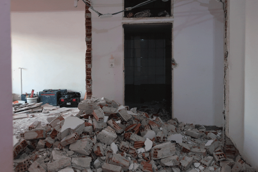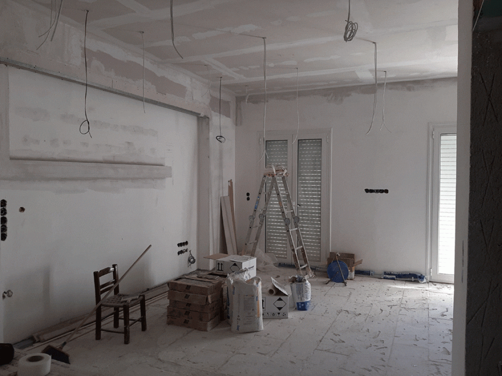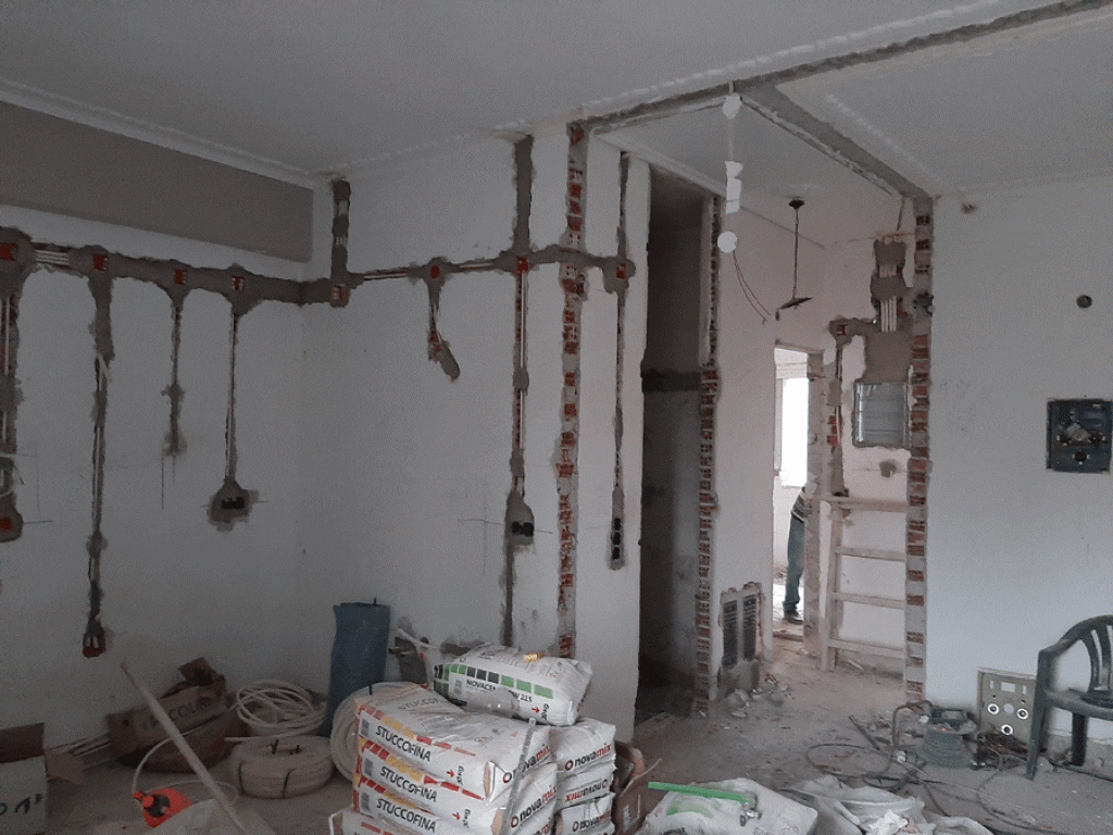 Εφόσον ολοκληρώθηκαν οι αποξηλώσεις και οι καθαιρέσεις των τοίχων για τη νέα διαμόρφωση, πραγματοποιήθηκαν οι ηλεκτρολογικές και υδραυλικές εγκαταστάσεις με τοποθέτηση συλλεκτών ύδρευσης – θέρμανσης.