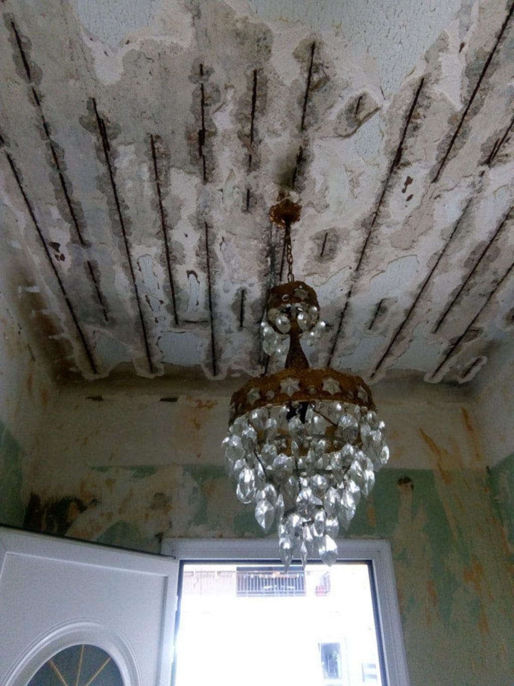 Μετά την αποξήλωση των αποκολλημένων τμημάτων σοβά της οροφής του διαμερίσματος, έγινε με τρόπο εμφανή η αποκάλυψη της διάβρωσης του σιδηροπλισμού της ταρατσόπλακας που ήταν και το μείζον.