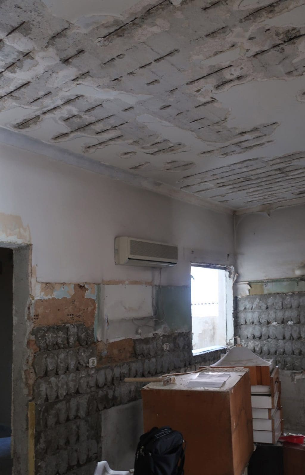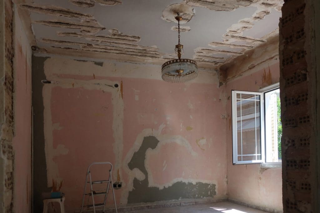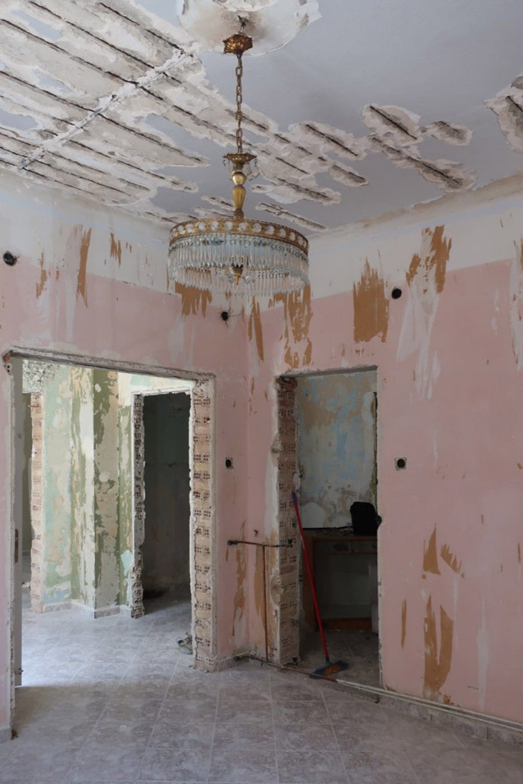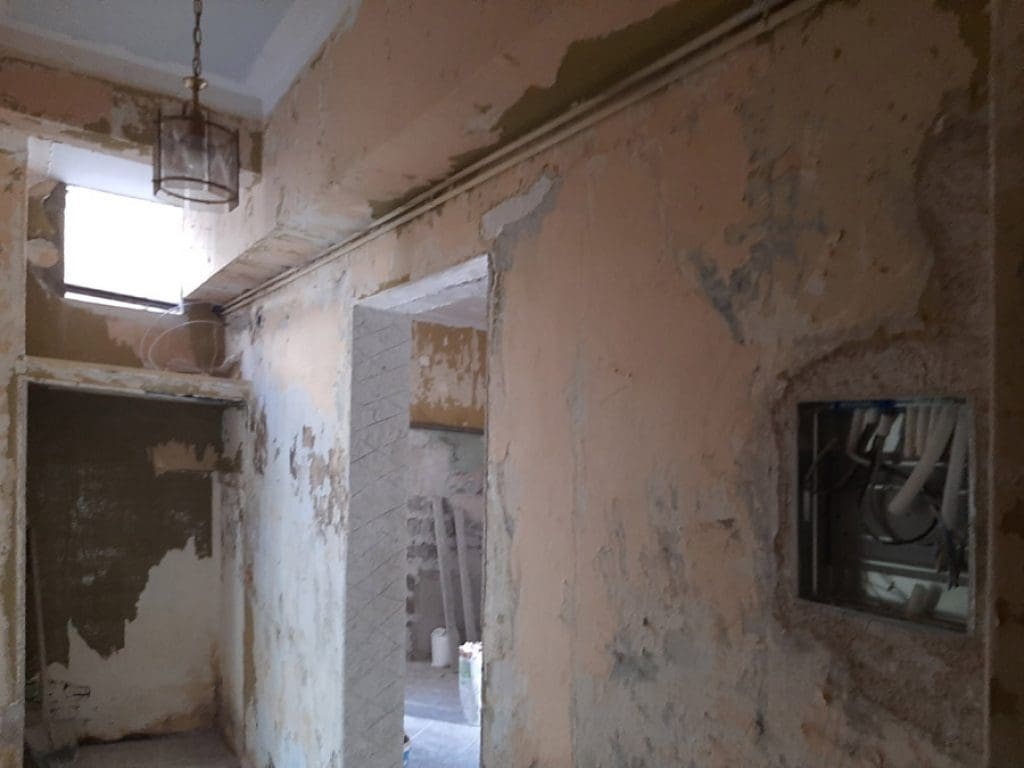 Αποκατάσταση της τοιχοποιίας με σπατουλάρισμα των τοίχων μετά την αποξήλωση πολλών στρώσεων ταπετσαρίας.