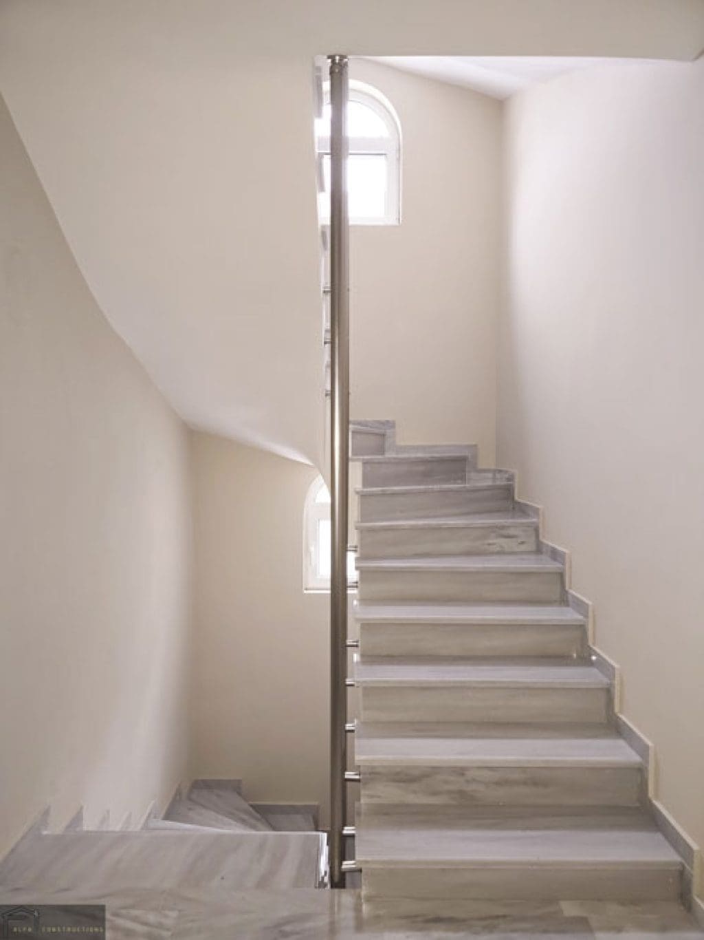 Η εσωτερική σκάλα της μεζονέτας επενδύθηκε με μάρμαρα και συμπληρώθηκε με κάγκελα αλουμινίου για ασφάλεια και αντοχή. Στους εξώστες τοποθετήθηκαν κάγκελα από γυαλί, προσφέροντας ανεμπόδιστη θέα και σύγχρονη αισθητική.