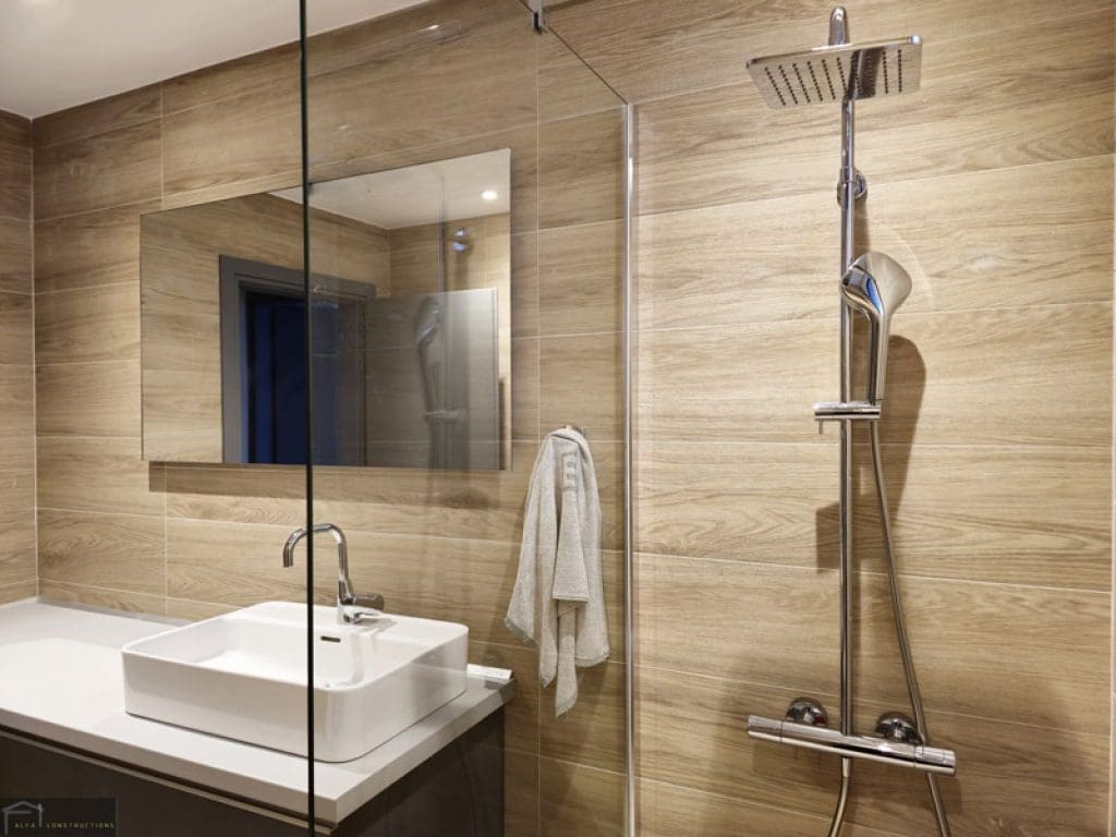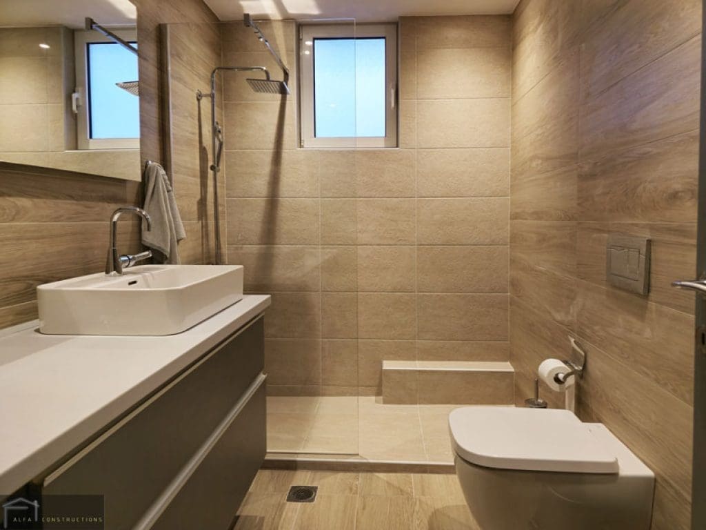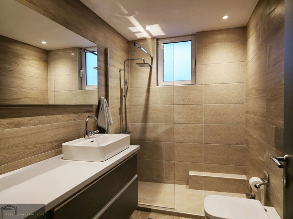 Ακολούθησαν οι εσωτερικές επενδύσεις και τα τελειώματα. Το δάπεδο επενδύθηκε με πλακίδια τύπου ξύλου, προσδίδοντας ζεστή και φυσική αίσθηση σε όλους τους χώρους. Στην κουζίνα τοποθετήθηκαν νέα έπιπλα σε σκούρο γκρι απόχρωση, ενώ στα μπάνια και το WC έγιναν πλήρεις τοποθετήσεις ειδών υγιεινής και πλακιδίων. Στην οροφή του καθιστικού τοποθετήθηκαν γυψοσανίδες που φιλοξενούν τον φωτισμό με σποτ.