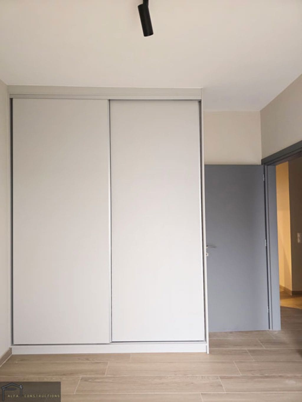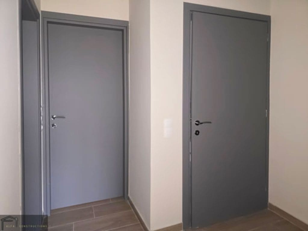 Τοποθετήθηκαν εσωτερικές πόρτες σε όλους τους χώρους και πόρτα ασφαλείας με επένδυση αλουμινίου στην κύρια είσοδο. Οι ντουλάπες κατασκευάστηκαν συρόμενες, εξασφαλίζοντας πρακτικότητα και εξοικονόμηση χώρου.
